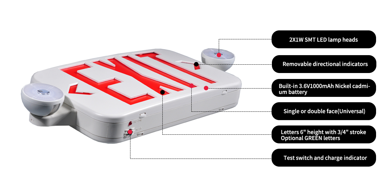 En effektiv och säker utgångsskylt / nödljuskombo. Spara pengar på att köpa denna 2-i-1-produkt. Långt, lågt underhåll av Ni-cad-batteri. Fungerar på 120 - 277 VAC Universal Spänning. Ansluten inkluderar knock-out vänster/högerpilar. Fixturen är 1 eller 2 -sidigt. Produkten är UL -listad och uppfyller NFPA 101, OSHA och UL 924 akutkoder. Som ett hem, kommersiell och industriell belysning, perfekt för korridor, korridor, sjukhus, lägenheter, kyrkor, köpcentra, stormarknader, skolor, hotell, pub, restaurang, lager, kontorsbyggnad, etc.