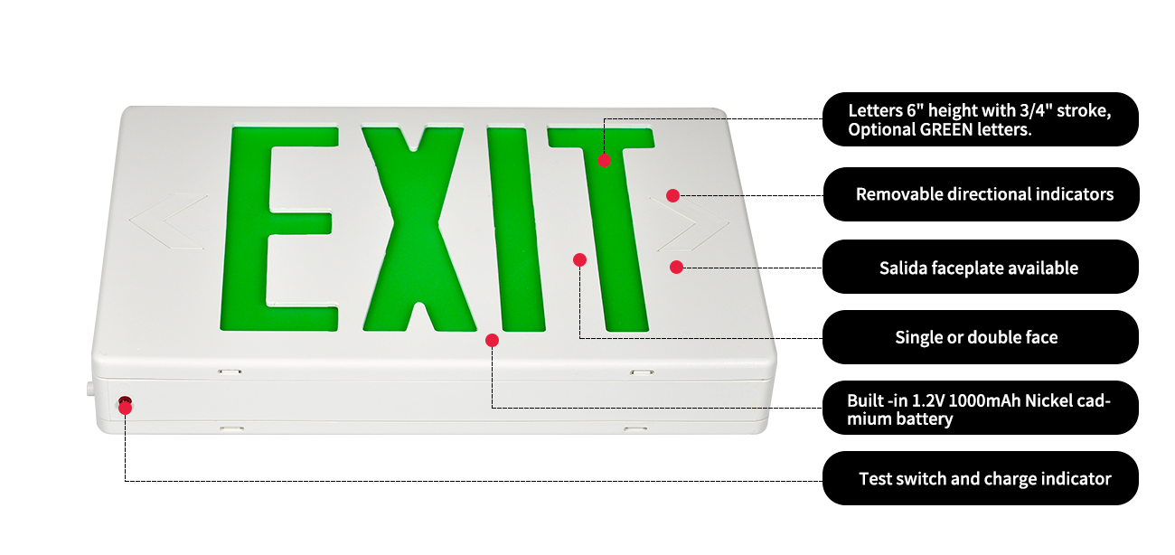 *Konstruktion - LED -utgångsskylten är konstruerad av formsprutade, V -0 -flamskyddsmedel, termoplasthus med hög påverkan. Vita bostäder är standard.