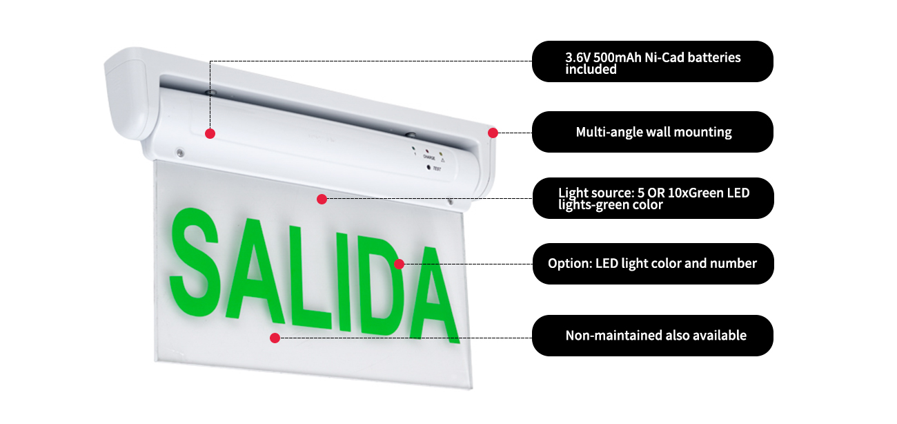 *Konstruktion - LED -utgångsskylten är konstruerad av gjutna ABS -bostäder med en klar akrylpanel. Vita bostäder är standard.